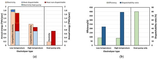 Energetic performances of the investigated process for the two types of electrolyzer units considered. For comparison, the estimated performance of an equivalent DH heat pump system is included (note that against the TCES process, heat pump only does not consume exclusively competitive electricity and therefore is indicated as “electricity”) (a) Annual net energy flows of the proposed scheme for the two types of electrolyzers analyzed. The dispatchable heat is generated in the discharging section, while the nondispatchable heat is generated in the charging section. The amount of nondispatchable heat that can be recovered if a heat pump is in place is marked within a dashed yellow line (b) Dispatchability ratios and energy efficiencies (electricity to heat) of the proposed scheme for the two types of electrolyzers analyzed. Note that the dispatchability ratio of heat pump only is 0.