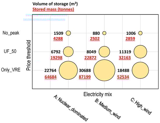 In this paper, the sizing of the storage is calculated as a function of the ADV, according to Equation (2). Instead of optimizing the sizing of the storage so that it can cover all the possible variations in a given year (as is common in other storage systems; see, e.g., [61]), a backup at a metal mill, which is located in the northern part of the country and available at all times, is assumed here (see Section 3). Thus, the storage size is here calculated for each of the nine scenarios on the basis of the types of variations that must be absorbed, i.e., to cover periods with a duration of ADV h.