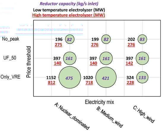 The required installed capacities of the reduction section units are plotted in Figure 10, in terms of the power capacities of the electrolyzers (MW) and the mass inflows of solids for the reduction reactor (kg/s). Note that both variables correlate directly with the reduction running hours, which means that the scenarios computed for the Only_VRE threshold again show the largest capacities. However, for the High_wind profile, the required capacities are reduced while keeping the operational costs low (as Only_VRE represents the threshold with electricity at the lowest prices). It can also be seen in Figure 10 that, as expected, the No_peak scenarios result in the smallest capacities, as the UF value of the reduction section is kept close to 1. When utilizing low-temperature electrolyzers, the computed capacity to be installed is in the range of 196–1150 MW, while the capacities of the more efficient high-temperature electrolyzers are on average 30% smaller, in the range of 140–812 MW. The reduction reactor’s inlet mass flow is between 82 kg/s for a UF value close to 1 and 475 kg/s for the scenario with the lowest UF value (0.17). Note that for the scenarios with the No_peak threshold, the capacity required for the reduction reactor is smaller than that required for the oxidation reactor (with an inlet solid flow of 108 kg/s). This is because with storage in place, the reduction section is allowed to operate during the summer months, in which case the oxidation reactor is turned off, therefore yielding a larger tred value than the case without storage. Nevertheless, for such a case, an additional inventory of solids would be required because the reduction reactor should be able to run independently of the oxidation reactor during the summer months.