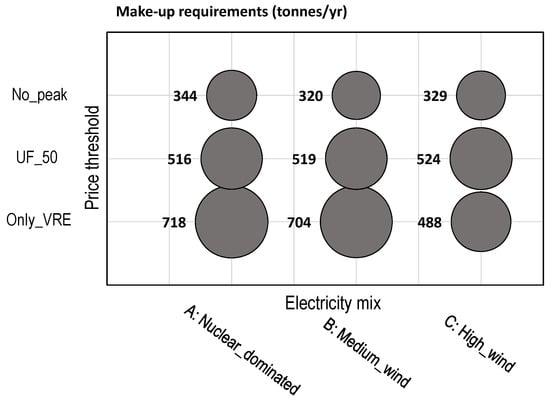 The computed inventories of the reduced solid materials (in tonnes) and the sizes of the storage silos (in m3) are shown in Figure 9. The required stored material linearly correlates with the ADV. Therefore, the required storage is largest for the Only_VRE threshold (52,534–87,199 tonnes), while the No_peak threshold requires the smallest material inventories (2500–4200 tonnes), as only electricity demand peaks with durations of 7–12 h are to be covered by the storage. Translating the masses of stored solids into volumes, the Only_VRE threshold requires a tank for the reduced solids with a volume of 18,000–30,000 m3, whereas for the No_peak threshold, a tank with a volume of around 1000 m3 is needed. Note that in all the scenarios, a second storage tank of similar size is required for the oxidized material. As expected, the results computed for the UF_50 threshold lie somewhere in between those for the other two thresholds for all the investigated scenarios. The computed tank sizes can be compared with conventional tanks found in process facilities such as refineries, which range in volume from 10,000 to 100,000 m3 for a single tank.