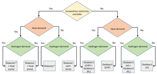 Because the operations of the reduction and oxidation reactors are decoupled through the addition of solid storage at ambient temperature, the sizing of the reactors (as presented in Section 4) can be designed so that the charging section operates only during periods of strong availability and competitive prices of renewable electricity (hereinafter referred to as competitive electricity), while the discharge section can be dispatched on the basis of demand for heat, i.e., following the same operational pattern as that applying to DH boilers operated today [46]. Nonetheless, there may be periods during which the heat demand can be covered by the charging section alone, as this section generates a considerable amount of nondispatchable heat. Thus, the proposed scheme increases the plant heat-generation capacity, and the use of the oxidation reactor can be reserved for periods of high heat demand and noncompetitive electricity prices. Thus, several operational modes can be defined on the basis of the availability of competitive electricity and the demand for heat, as displayed in Figure 2. First, as the additional heat production is nondispatchable, its utilization is prioritized, and the heat demand should as a matter of priority be covered by the nondispatchable generation. The possibility to boost heat production is also enhanced by the installation of a heat pump, which can be used to recuperate the heat losses generated while reducing the metal. In addition, operating both the reduction and oxidation sides is possible under conditions of very high heat demand and competitive electricity prices.