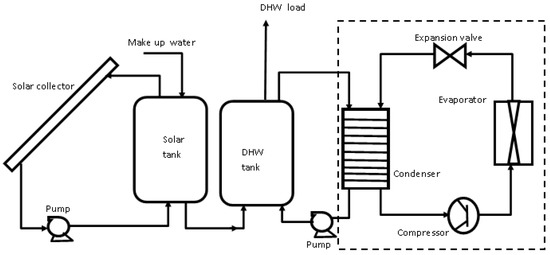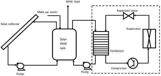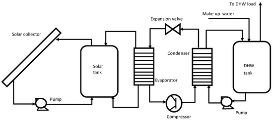 The series system may be divided into two types: direct expansion (DX-SAHP) and indirect expansion (IX-SAHP) [40,41]. The IX-SAHP utilizes a water loop heat pump system where the evaporator side of the heat pump unit is connected to the hot water produced by the solar collector. The heat harnessed by the solar collectors is transported indirectly to the evaporator of the heat pump as shown in Figure 1.