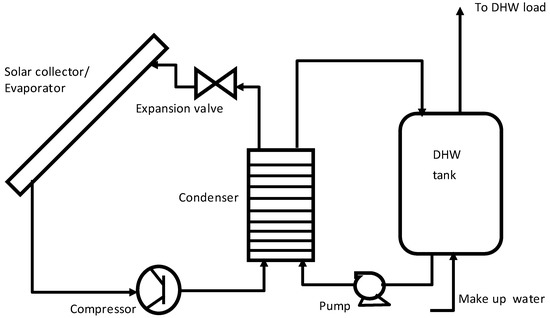 The ultimate performance of an SAHP system depends on the size and configuration of the sub-components that must match the demands of the load and the availability of the daily solar radiation [18]. An SAHP system comprises four basic sub-components, including the collector–evaporator (which may act as single or combined components depending on the type of SAHP), compressor, thermal expansion valves, and the storage–heat exchanging tank. Studies conducted on SAHP systems show that the collector (also the evaporator for direct series type SAHP systems) and the compressor are the most impacted components with respect to the amount of heat incidence on the system from the heat source [19]. Additionally, both the compressor and water circulation pumps are the power consuming devices in an SAHP system.