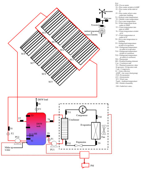 Figure 5 shows the 2D schematic diagram of the installed efficient DX-SAHP water heater. It comprises a 2000 L, 24 kW electric boiler retrofitted by solar collectors (8 evacuated tubes collectors arranged as a balance parallel system with each branch containing four series-connected evacuated tubes collectors) and a 6.0 kW input ASHP unit. The 24 kW heating element in the electric boiler was disabled and retrofitted with both the solar collectors and the 6.0 kW input ASHP unit. The major components of the ASHP unit are the evaporator, compressor, condenser, and expansion valve. Makeup cold water from the incoming mains water was used to fill up the storage tank during hot water consumption as a result of the demand for hot water by the students in the accommodation. A copper pipe was connected between the storage tank and the inlet of the solar collectors while a three-phase 370 W water circulation pump (PU2) and a flow meter (F2) were installed on the copper pipeline. A copper pipe was connected between the outlet of the solar collectors and the storage tank. The 370 W water circulation pump (PU2) helped the water to circulate between the storage tank and the solar collectors during the heating cycles. The water temperatures at the inlet and outlet of the solar collectors were measured using temperature sensors (T6 and T7). The flow meter (F2) measured the volume of water heated by the solar collectors during the heating cycles and the water was stored in the storage tank. A copper pipe was connected between the storage tank and the inlet of the ASHP unit while a single phase 100 W water circulation pump (PU1) and a flow meter (F1) were installed on the copper pipeline. A copper pipe was connected between the outlet of the ASHP unit and the storage tank. The 100 W water circulation pump (PU1) assisted in the circulation of water between the storage tank and the ASHP unit. The flow meter (F1) measured the volume of water heated by the ASHP unit during the vapor compression refrigeration cycle (VCRC). The water temperatures at the inlet and the outlet of the ASHP unit were measured using temperature sensors (T5 and T4). Temperature sensors (T1, T2, and T3) were installed at the bottom, middle, and top of the storage tank and measured the water temperatures at the respective positions in the storage tank. A copper pipe was connected to the storage tank and supplied hot water to the destinations in the building, while a temperature sensor (T8) and a flow meter (F3) were installed on the copper pipe and in the proximity of the outlet of the storage tank. The flow meter (F3) measured the volume of hot water consumed by the occupants in the building while the temperature sensor (T8) measured the outlet water temperature from the storage tank into the building. Temperature sensors (T9 and T10) were installed at the inlet and outlet of the evaporator of the ASHP unit. These temperature sensors (T9 and T10) measured the refrigerant temperatures at the inlet and outlet of the evaporator. Temperature sensors (T11 and T12) were installed at the inlet and outlet of the condenser of the ASHP unit. These temperature sensors (T11 and T12) measured the refrigerant temperatures at the inlet and outlet of the condenser. Ambient temperature and relative humidity sensor, pyranometer, anemometer, and wind vane were installed in the vicinity of the solar collectors. The ambient temperature and relative humidity sensor measured the ambient temperature and relative humidity. The pyranometer measured the global solar irradiance incidence on the solar collectors. The anemometer measured the wind speed while the wind vane measured the wind direction. A quality track analyzer (three-phase power meter with inbuilt data logging capability) was installed on the power supply line powering the DX-SAHP water heater. All the measuring sensors were connected to data loggers to store the recorded data. All the data loggers were configured to log in 1 min intervals throughout the monitoring period using hoboware pro software. The stored data from the data loggers were downloaded to a laptop via USB cable for further processing using MATLAB. The installed DX-SAHP water heater was automatically controlled with the incorporation of the solar controller and the controller for the ASHP unit.