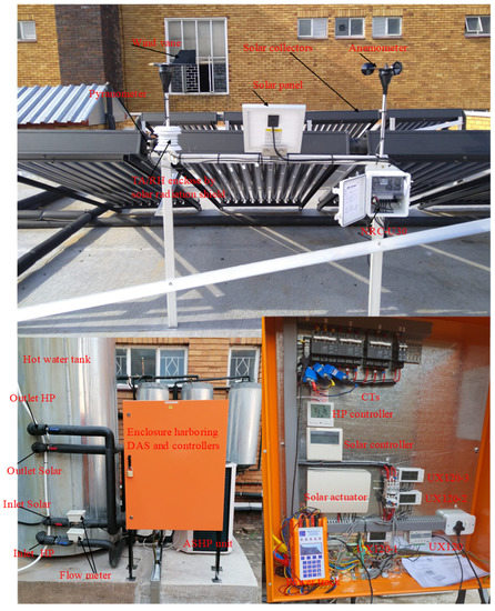 The twelve temperature sensors were copper pipe thermocouples and were connected to three, four-channel UX120 hobo analog data loggers. The temperature sensors (T1, T2, T3, and T8) were connected to one of the UX120 hobo analog data loggers (UX120-1, as shown in Figure 6). The temperature sensors (T4, T5, T6, and T7) were connected to the second UX120 hobo analog data logger (UX120-2, as shown in Figure 6) while the rest of the temperature sensors (T9, T10, T11, and T12) were connected to the third UX120 hobo analog data logger (UX120-3, as shown in Figure 6). These UX120 hobo analog data loggers (UX120-006M) were powered by two AA 1.5 V batteries. The flow meters (F1, F2, and F3) were connected to a four-external-channel input pulse data logger (UX120-017M) and were powered by two AA 1.5 V batteries. The ambient temperature and relative humidity sensors, pyranometer, anemometer, and wind vane were connected to a no-remote communication data logger (NRC-U30 data logger). The NRC-U30 data logger was powered by a 4.5 V battery which was charged from a 5 W solar PV (photovoltaic) panel, and is shown in Figure 6. The electrical power consumed by the DX-SAHP water heater was measured using a three-phase power track analyzer with an inbuilt data logger. The installed temperature sensors were insulated with insulation tapes and the ambient temperature and relative humidity sensors were protected by the solar radiation shield. The installed flow meters were enclosed by protective weatherproof enclosures. All the data loggers were configured to log every 1-min interval throughout the monitoring period (3 month period, from January to March 2022) using hoboware pro software.