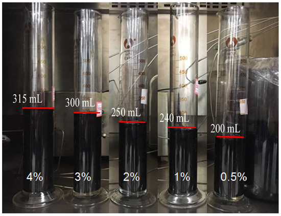 The main role of foam liquid is to make N form foam with liquid, and stop N from quickly de-gassing from crude oil. A small volume of crude oil is added to the foaming agent to test its oil resistance. This experimental method is inconsistent with the volume ratio of oil to foam agent under reservoir conditions. The static properties of the foaming agent were evaluated in this study by mixing the foaming agent with crude oil at concentrations of 0.5%, 1.0%, 2.0%, 3.0%, and 4.0%, using a Waring blender. As can be seen from Figure 2, when the foaming agent concentration exceeds 1.0%, the foam volume growth is still obvious, but the growth rate gradually slows down.