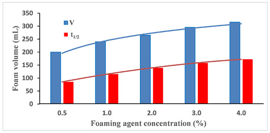 In order to make the experimental results more intuitive, the foaming volume and half-life at different foaming agent concentrations were plotted (Figure 3).