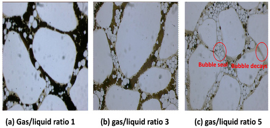Through a 2D microscopic visualization experiment, it can be seen that with the increase in gas/liquid ratio, the number of bubbles per unit area gradually increases, but the bubbles still exist in the form of tiny bubbles, and there is no obvious coalescence phenomenon. According to Figure 4c, bubbles accumulate in the larger pores and are overstocked and deformed by the pores, resulting in a blocking effect on the larger pores and forcing the subsequent foam to enter the small pores that were not affected earlier. Bubbles constantly contact and rupture with crude oil in small pore channels, and dissolve and reduce the viscosity of residual oil in pores under the emulsification of surfactant, so as to reduce the oil–water interface tension and improve the flow performance of residual oil. The experimental results show, that under the premise of a certain period of gas injection, if the gas/liquid ratio is small, the foaming liquid dosage is large and the cost is high. If the gas/liquid ratio is large, it is difficult to bind enough gas to form foam, and part of the gas comes out as free gas, which makes it difficult to play the role of foamy oil. The optimal gas/liquid ratio should be between 3∼5.