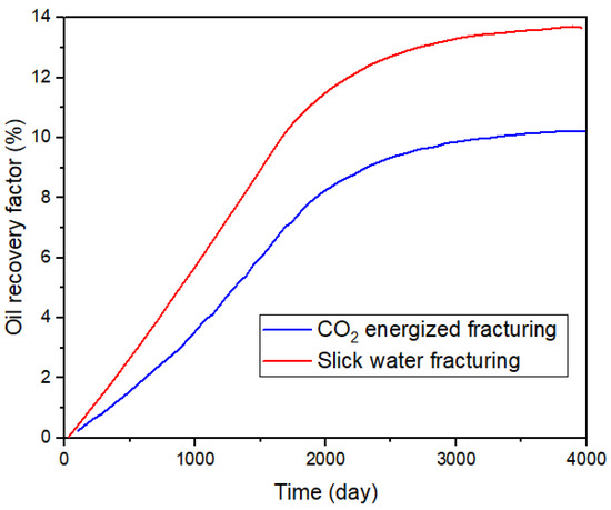 The effects of CO-energied fracturing and slick water fracturing on the recovery factor of the reservoir were studied to explore the effect of different fracturing technologies on the development of deep heavy oil reservoirs. Slick water fracturing is simulated by injecting slick water and displacement fluid in sequence. CO-energied fracturing is simulated by injecting liquid CO and displacement fluid in sequence. Figure 5 shows the comparison of oil recoveries under different fracturing techniques.