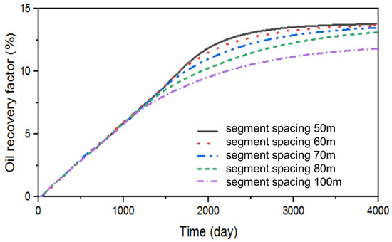 Figure 6 displays a comparison of oil recoveries under different segment spacings. As can be seen from Figure 6, the smaller the segment spacing, the higher the reservoir reconstruction density and the better the stimulating effect. However, segment spacing is related to fracturing technology level and reservoir conditions. The closest segment spacing can reach 60 m at the current volume fracturing level. When the reservoir conditions are good and the permeability is low, subdivisions can be implemented, with 60 m segments and three clusters per segment based on current technology levels.