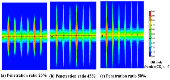 As can be seen from Figure 7, the CO injected in low permeability reservoirs is more obvious to dissolve along the fracture, but fracture channeling should be considered more for the half-length of the main fracture. According to the simulation results, when the adjacent wells are fractured by staggered fracturing, the half-length of the main fracture is about 80 m to 90 m, and the fracture penetration ratio is controlled at 40% to 45%. After fracturing, adjacent wells can basically form a pressure connected fracture network, while avoiding fluid communication.