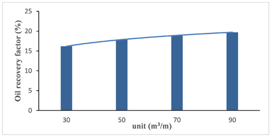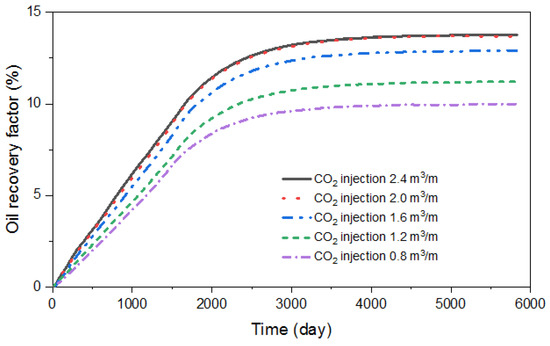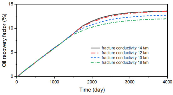 To achieve better conductivity, higher displacement fluid strength is required. Figure 8 displays the comparison of oil recoveries under different fracture conductivity. According to the simulation results, the higher the displacement fluid strength, the better the fracture conductivity, the wider the fluid supply range, and the higher the production. The recovery factor increases when the displacement fluid strength reaches 12 t/m, but the amplitude of the increase decreases.