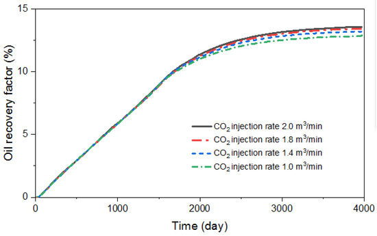Figure 10 displays a comparison of oil recoveries under different CO injection rates. As can be observed in the figure, with the increase in CO injection rate, the oil recovery rate also increases. When the CO injection rate reaches 1.8 m/min, the increase in oil recovery rate becomes insignificant.