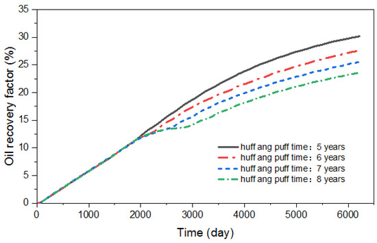 Different from high-viscosity foam oil, low-viscosity oil starts to degas rapidly when the pressure is lower than the bubble point, and the oil viscosity rises sharply. The huff-n-puff effect then drops sharply. Figure 12 shows the variation in oil recoveries under different huff-n-puff timings.