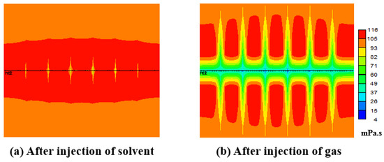 As can be seen from Figure 13, the solvent pre-slug first spreads through the fracture and gas is injected to drive the olvent pre-slug further into the reservoir. As can be seen from Figure 14, the solvent pre-slug and gas displacement can exert the rapid viscosity reduction effect of the solvent and reduce the oil viscosity below 50.0 mPa·s. Therefore, injecting the solvent pre-slug before gas injection and displacing it into the reservoir during gas injection can expand the viscosity reduction region.