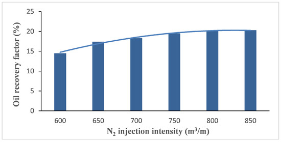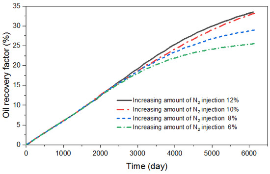 Figure 16 shows the comparison of huff-n-puff under different N intensities. According to simulation and comparison, the larger the N injection volume, the larger the affected area, and the better the production effect. When the injection volume reaches more than 750 m/m, the oil increase decreases significantly.