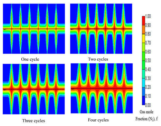 Figure 18 displays the distribution range of N in different periods (mole fraction, increment 10%). The volume of N injected in cycles 2 to 4 increased by 10%, and the volume of N injected in subsequent cycles was maintained.