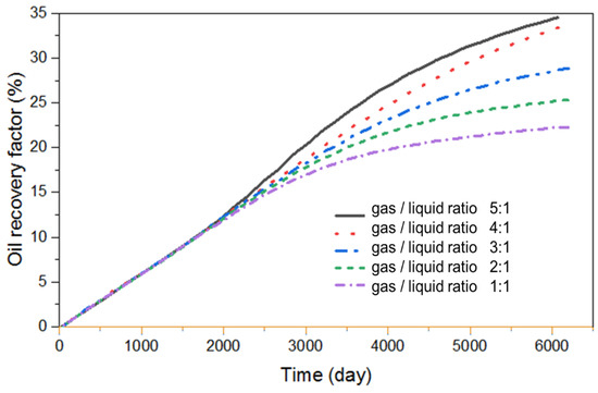The comparison of huff-n-puff oil recoveries under different gas/liquid ratios.