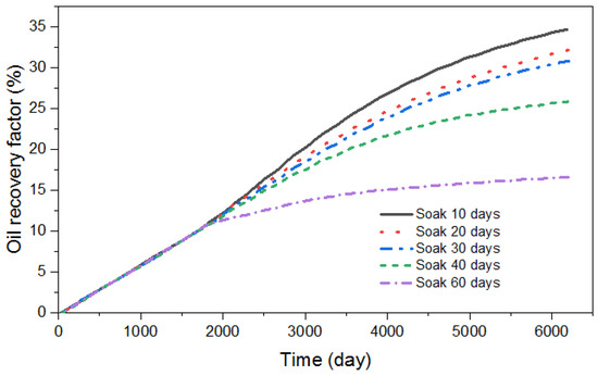 The comparison of huff-n-puff oil recoveries under different soaking time.