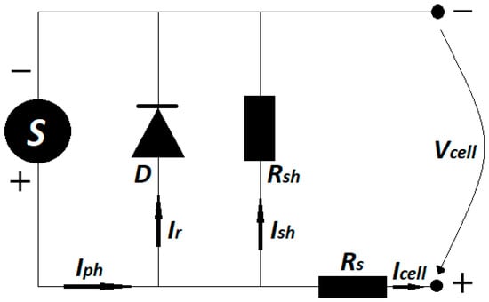 PV cell electrical model. S and D—photo-sensible and diode-type components of solar cell. Rs, Rsh—series and shunt resistance, respectively.