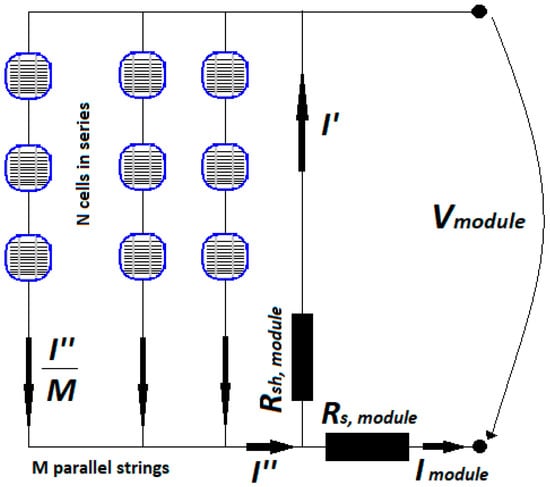 The method proposed in this article is developed for a simple series-parallel scheme. It can also be implemented for other interconnection schemes. A PV module of M parallel strings, each of them consisting of N identical solar cells, is shown in Figure 3. The relation between the voltage across the PV module, Vmodule, and that across the solar cell, Vcell, is given by: