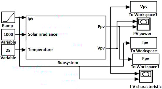 The drawing of a PV module was entirely developed in MATLAB/Simulink to characterize the electrical characteristics (see Figure 4). It presents the methodology of the simulation technique used for electrical characteristics of the PV module, namely, the I-V and P-V characteristics of the PV module. A notable advantage of this approach in the MATLAB environment is the fact that once created, the photovoltaic generator model it can be later interfaced with current system models that make possible to simulate complex photovoltaic systems and their interaction with other systems. A major advantage of using MATLAB software is its availability in most academic research and industrial organizations, being useful for a wide range of engineering disciplines.
