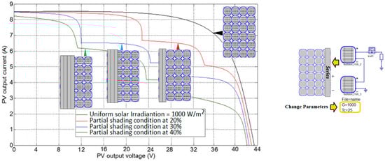 To analyze the dynamic behavior of the studied PV module, an algorithm based on the series-parallel method was introduced; the considered model described in Section 3 was implemented and evaluated in MATLAB/Simulink environment, considering the changes of solar irradiance and temperature registered by the photovoltaic system, in conditions of its partial shading. Three situations of partial shading of the PV module were investigated: 20%, 30% and 40%. Under conditions of complete (standard) solar irradiance, characteristics I-V have a single maximum power point; on the other hand, when the PV module is partially shaded, there are several maximum power points.