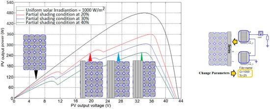 A shaded module in a string can significantly reduce its output power, however, a shaded module in a string does not reduce the output power of a parallel string. Therefore, a feasible and efficient solution is given by the grouping of shaded modules in separate strings (parallel series), thus, the total output power of the photovoltaic array can be maximized [49,50,51]. For example, in a real PV system, it can be beneficial to group modules that receive shade from parapets in strings and keep modules that do not receive shade from parapets in separate, parallel strings. In this way, the unshaded strings can maintain a higher current and power. However, to determine the effect in which shading affects the PV module, a theoretically complex approach based on modelling and numerical simulation of the electrical characteristics of the PV array is required [52].