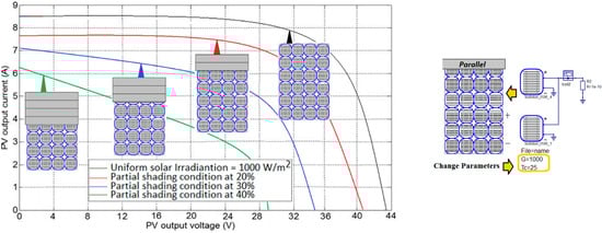 Current-Voltage characteristics under different partial shading conditions for parallel approach.