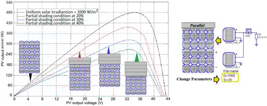 Power-Voltage (power characteristics) under different partial shading conditions for parallel approach.