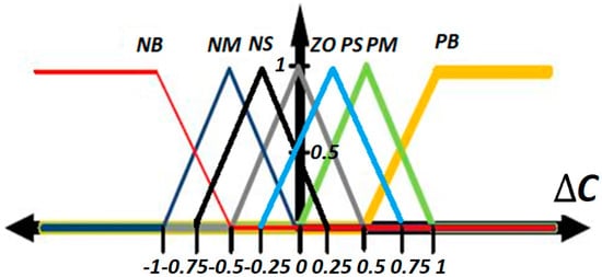 The output variable is represented by a normalized fuzzy set of five triangular MFs: Large Negative (NB), Medium Negative (NM), Low Negative (NS), Zero (ZO), Small Positive (PS), Medium Positive (PM) and Large Positive (PB) (see Figure 14). The mathematical characterization of the membership for the triangular function is presented below in the relations (18–24).