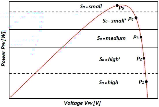 The P-V characteristics of the PV panel could be divided in five regions (with 5 points power operations), depending on the value of the absolute power slope—Sa (see Figure 15). The FLC controller will cause the change to a new step; ΔC—exit membership is based on the old disturbance—Cold to reach the MPP.