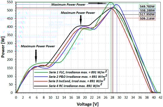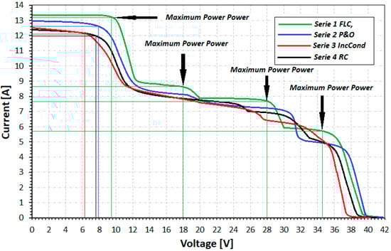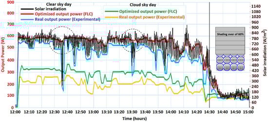 Another method to improve the efficiency of a PV module in the case of partial shade is the implementation of a DC optimizer whose role is to adjust the output voltage and current and implicitly to maintain the maximum power without compromising the performance of other modules. This is achievable and possible by studying algorithms for optimizing the maximum power point, such as the FLC (Fuzzy Logic Controller) technique [53]. Such an approach allows for modelling and simulation the behavior of PV modules in an efficient manner that also allows the adjustment of the way the panels work, respectively, their operational optimization. At the same time, an optimization method based on MPP tracking algorithms ensures accuracy in terms of output power optimization, which is why numerous studies and researchers have continued to develop these models in order to increase the degree of usefulness and performance in terms of efficiency PV systems [54].