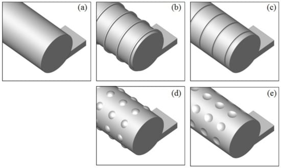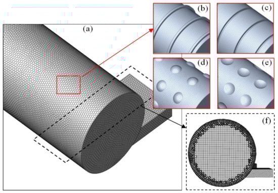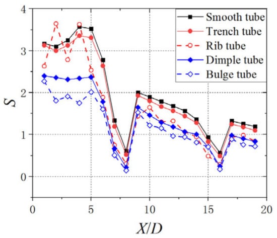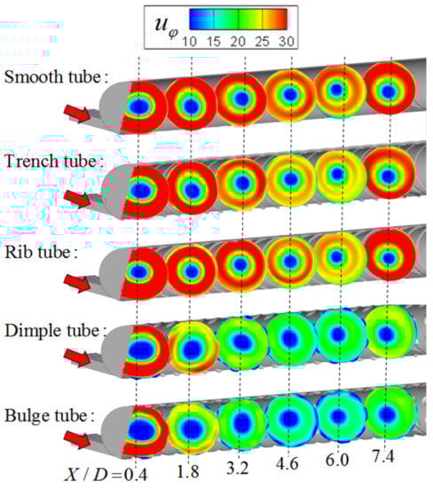 - The circumferential velocity and swirl number are introduced to describe the flow fields and reveal the flow mechanism. The trenches and ribs have little influence on the circumferential velocity distribution and lead to less of a reduction in the swirl intensity. However, the surface dimples and bulges significantly suppress the swirl intensity by up to about 40.8%.