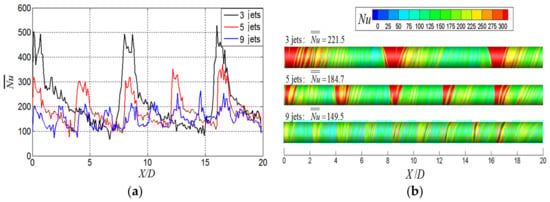 - The number and spacing of the tangential inlet jet have a significant influence on the heat transfer performance of the swirling flow. As the jet number increases from three to nine, the averaged Nusselt number decreases, and the heat transfer uniformity is obviously improved.