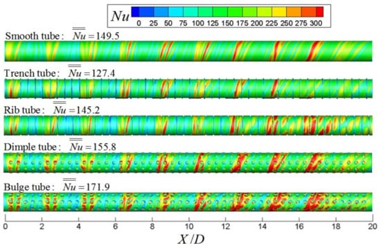- The surface dimples and bulges are conducive to improving the Nusselt number on the swirl tube wall; however, placing trenches and ribs shows Nusselt number deterioration relative to the smooth swirl tube. With a smaller jet spacing and more jet injections, the effect of surface structures tends to be more positive.