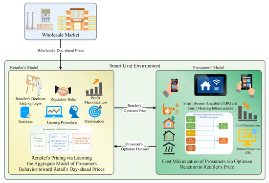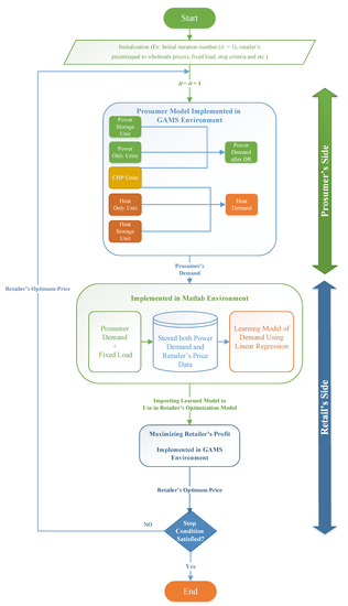 With the rapid rise in global demand for energy consumption and ever-increasing human dependence on electrical energy, as well as growing environmental concerns over pollutant emission, and volatile energy prices, the exploitation of high-efficiency energy generation methods (such as combined heat and power (CHP)) and smart grid technologies are of paramount importance [1]. The spread of the smart grid and the employment of advanced metering infrastructures (AMI) have enabled a mutual connection between consumers and other entities, such as retailers [2]. The benefits of this capability have enabled the introduction of several key concepts, including demand response (DR), prosumers (active consumers capable of producing, consuming, and storing both electrical and thermal energies), retail markets, and local energy markets [3]. Unlike conventional power systems, consumers in such an environment can actively react to market price bids and sell their surplus generated energy, as well as minimize the costs of their needed energy [4]. Therefore, such consumer behavior can result in a more dynamic and competitive market. Likewise, as a profit-centered entity in a smart grid environment, the retailer seeks to maximize its profit by predicting the consumers’ behavior, optimal energy pricing, and meeting the consumers’ energy demand at minimum cost [5]. Based on these considerations, the computational burden of centralized optimization methods and the privacy of local (retail) market players are of particular concern [6]. The motive to avoid privacy breach of prosumers has directed the retailers toward new tools, including machine learning, which do not require all (private) information of players to ensure optimal pricing with minimum information exchange [7]. One of the less-studied issues in retail energy management is the prosumers’ participation in DR programs and cost minimization of energy needs from their (prosumers’) view. In studies related to short-term scheduling of retailer energy management, the prosumers help the retailer’s optimal pricing via participation in the DR program. The proposed problem is then solved in a centralized manner, assuming access to all players’ information [8]. In other words, these studies have violated the prosumers’ privacy from two aspects. First, although the DR program is considered for prosumers, it is implemented from the retailer’s view. In other words, the retailers are in control of the flexible loads and can shift the loads based on their goals without considering the prosumers’ privacy. In fact, they assume that the prosumers will certainly participate in the proposed DR program. From the second aspect, the retailer has access to all prosumers’ information. The proposed optimization problem is solved from the retailer’s viewpoint in a centralized manner, which further compromises the players’ information privacy.