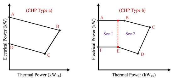 CHP units are utilized for cogeneration of heat and power. The thermal and electrical output power of CHP is interdependent, and this relationship is shown by a curve known as a feasible operational region (FOR) [28]. In this paper, two types of curve are considered in the modeling. A detailed description of the modeling of these units is provided in the following [13]. Equations (1) and (2) determine the CHPs operating points in the FOR region [13], where is the electrical power generated by the i-th CHP at time t, is a binary variable showing the on or off state of the i-th CHP at time t, and is the heat power generated by i-th CHP at time t. Equations (1) and (2) can be expanded to (3)–(16) separately for the first and second types of CHP. As the first type of CHP scheme in Figure 2 shows, Equations (3)–(7) describe feasible regions of first type CHP [13]. According to first type of CHP illustrated in Figure 2, Equation (3) shows the area below the AB line, whereas Equations (4) and (5) model the upper areas of the BC and CD lines, respectively. Equations (6) and (7) also describe the generation limits of electrical and thermal output power. As is evident from the second type of CHP scheme in Figure 2, Equations (8)–(16) describe feasible regions of second type of CHP [13]. According to Figure 2, the feasible region of second type CHP is nonconvex, and divided into two convex regions by decision variables and . The position of the CHP’s operating point is determined by two binary variables and . Hence, the operating point could be placed in either of the two areas dependent upon whether the CHP is on or off in that area, and this condition is expressed in Equation (14). The cost of CHP systems can be calculated from Equation (17). In this equation, is the price of natural gas and is the efficiency of CHP units. We have