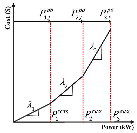 In this paper, microturbines are considered as power-only units. The equations related to the operation and cost of these units are given below [13]. Equations (18) and (19) express the power generated by power-only units. In these equations, is the output power of power-only unit q at time t and block , is the nominal power of block of power-only unit q and is the number of blocks in unit q[13]. Equations (20) and (21) exhibit the limitations of generation ramp-up and ramp-down, respectively [13]. In these equations, is the spinning status of unit q at time t, is the ramp-up rate, and is the ramp-down rate. The minimum up and down times are modeled in Equations (24) and (25) by using the auxiliary binary variables and [13]. In addition, Equations (22) and (23) express the minimum up- and downtime constraints. The cost function of the power-only units is presented as piecewise linear, as shown in Figure 3 and Equation (26). We have