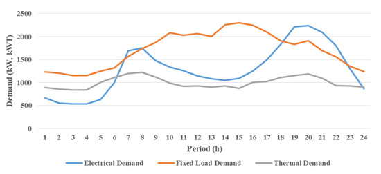 In the prosumer energy management problem, two CHP types are assumed based on data from Table 2 [13]. Table 3 shows data related to power-only units [8], and data associated with the electrical [8] and thermal storage are given in Table 4 and Table 5, respectively. Figure 5 displays the thermal and electrical power demand in the prosumer problem [13] and also the retailer’s fixed electrical load [10].