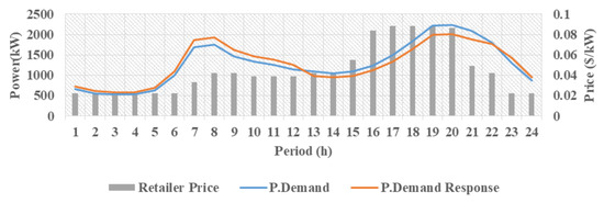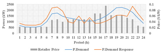 The first case assumes that the prosumer can vary its declared consumption as much as 30% per hour; however, the sum of consumed powers after demand response in 24 h equals the sum of initial power due to the regulatory contract. In other words, only load shifting occurs during certain hours. Figure 6 illustrates the retailer pricing, the predicted initial load as well as the type of demand response to the retail prices. As is evident, from 1 to 9 a.m. and from 10 to 12 p.m., the prosumer decides to increase its demand due to low retail prices. On the contrary, during midday from 3 to 9 p.m., when the retailer raises its price, the prosumer responds to this behavior by decreasing demand through demand response. From 10 a.m. to 2 p.m. because of approximately equal retailer prices, the prosumer displays a volatile behavior around its predicted initial load.