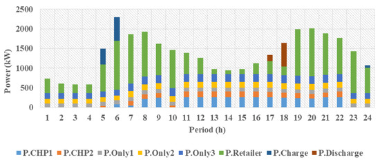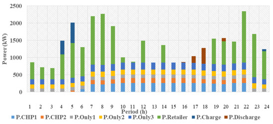 Figure 7 shows the production share of electrical power from its production sources, electrical storage charging, and discharging and power supplied per hour by the retailer. This figure displays the prosumer’s power supply behavior from its production units considering the retailer’s prices. At 4, 5, and 24 o’clock when the retailer’s price is low, the prosumer has stored the electrical energy and consumed it at 4, 5, 6, and 8 p.m. to purchase less power from the retailer due to its high prices. It is noteworthy that as the prosumer has to deliver the initial amount of charge received from storage at the end of the day, we have storage recharging at midnight. In addition, because of the high retailer’s prices at 1 and 3 to 6 p.m., the prosumer has preferred not to purchase from the retailer. At all hours, the prosumer has supplied a portion of its power from power-only units owing to their low cost. Moreover, at hours during which the retailer’s price has increased, the prosumer has preferred to supply a portion of its power from CHP units.