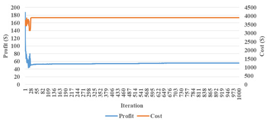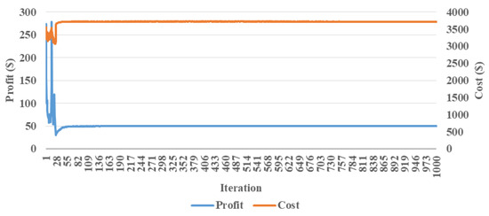 The key point of this study is that the retailer’s profit and cost of the prosumer problem reach equilibrium and converge by using the proposed algorithm, as depicted in Figure 8. This means that the proposed method is effective, and demonstrates that both prosumer and retailer have reached a balance in their interactions, and do not intend to change one another’s strategies. The retailer’s profit obtains convergence to a profit equal to $50.2 after an appropriate number of iterations. As is clear, the prosumer cost converges similarly to the value of $3723 after a proper number of iterations. There are also some fluctuations in profit and cost plots before 82nd iteration, associated with the prediction error of the multivariate linear regression method.