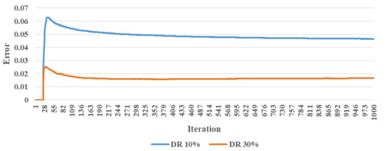 Figure 12 shows the prediction error of the multivariate linear regression method. Here, prediction error is evaluated by the mean absolute error (MAE) method. As is evident, the prediction error is low at initial iterations owing to the insufficient data, which reflects the accuracy of the prediction made by this method. As the iterations proceed, which also increases data, the error slightly rises; however, it eventually achieves convergence due to sufficient data. The prediction error converges to appropriate values of 5% and 2% for 30% and 10% demand responses, respectively. Needless to say, as prosumer behavior is more limited with regard to demand response, the retailer’s prediction error also declines in the 10% demand response case study. Notably, the maximum number of iterations is considered as n = 1000 to ensure convergence of the prediction error. Figure 13 displays the types of retailer’s pricing with respect to the purchase prices from wholesale. The correlation coefficient for wholesale and retail price plots is calculated to be 0.8836 and 0.8657 for 30% and 10% demand response, respectively. The results show a decrease in the calculated coefficient with demand response. The reason is that the increases in demand response force the retailer to declare prices closer to wholesale prices to the prosumer for increasing its maximum profit. Prosumer cost, retailer’s profit, and correlation coefficient of retail and wholesale prices are compared in Table 6. As is evident from the table, the retailer’s profit has decreased, along with the prosumer cost, with an increase in demand response. The retailer has been forced to declare prices closer to wholesale prices to achieve its expected maximum profit. As an example, in the 10% demand response case study, the prosumer cost decreased by 3.57%, compared to the case of no-demand response, whereas in the 30% demand response case study, this reduction reached 8.14%. Furthermore, as a result of the proposed distributed approach in this paper, the problems of the retailer’s profit maximization and prosumer cost minimization have been solved separately. With more demand response to its suggested prices, the retailer’s profit also dropped by 4.33% and 13.71% for 10% and 30% demand response case studies, respectively. In both case studies, the retailer’s profit and prosumer costs decreased with more demand response. Another issue is the preservation of prosumer privacy by the retailer. Although the retailer had no information about prosumer’s behavior and types of their demand response, still, with data increasing over iterations, it provided a more accurate estimation of the prosumer behavior model, and the proposed approach led to problem convergence for both case studies.
