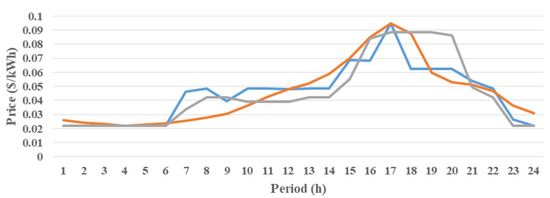 In this paper, the demand response model is assumed as load shifting at times of higher market prices. Equation (39) describes the power demand following a demand response. Equation (40) describes load shifting, Equation (41) expresses that the sum of loads in 24 h cannot change, and Equation (42) demonstrates the limitation of demand response per hour [30]. We have