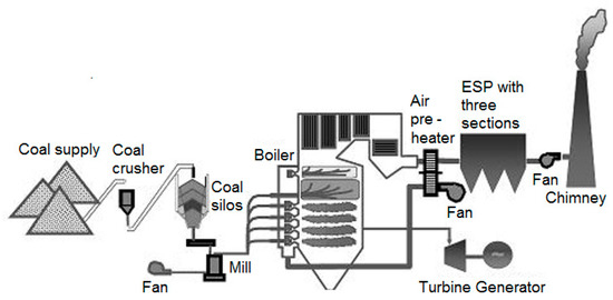 To improve the efficiency of ESPs, the following technological parameters must be considered: how fuel is crushed, the quality of the fuel, how combustion is carried out in the boilers, the resistivity of the dust and, last but not least, the constructive way of the ESP [23,31]. Using low-quality coal with a high ash content increases the amount of dust in combustion emissions. Incomplete combustion is caused by increased fuel moisture.