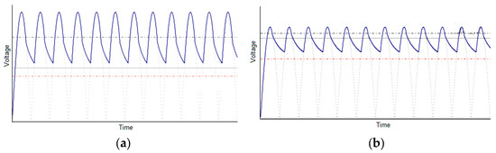 In settings where the maximum voltage remains constant (and the corona onset voltage remains constant), the average and minimum voltages decrease in value as the degree of intermittentness increases (Figure 4). The form factors k1 and k2 grow in proportion to the degree of intermittency [14,35,36].