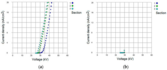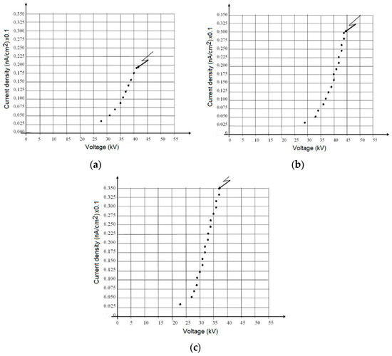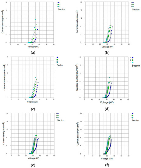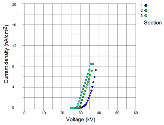 Current density-voltage characteristics for an ESP with three sections: (a) section 1 (input); (b) section 2 (intermediate); and (c) section 3 (output).
