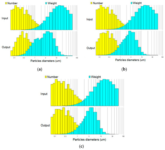 When a classical supply is applied to the sections, the dispersion of dust particles at the input and output of the ESP is simulated on the basis of their number and mass. At the input, particles with small diameters have a higher number, while particles with larger diameters have a higher mass. A dust particle distribution similar to what exists in reality was employed [10,24,25]. The dust distribution at the entry is kept constant in the simulations shown in Figure 9.