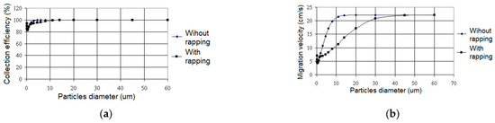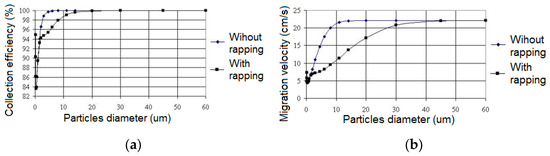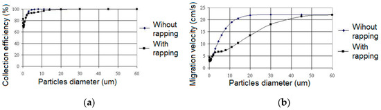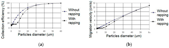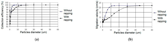 (a) The collection efficiency depends on the diameter of the dust particles. (b) The migration velocity depends on the diameter of the dust particles, without and with rapping, and the thickness of the 1 mm dust layer.